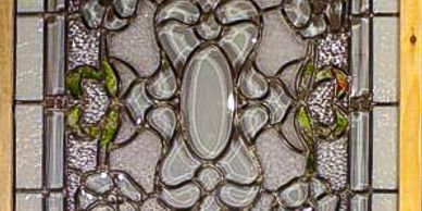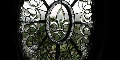 Oval design utilizes multiple bevel sets to for the border and the center focal design. The overall design matches the wooden mullions in the exterior glass / wood window.