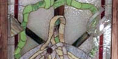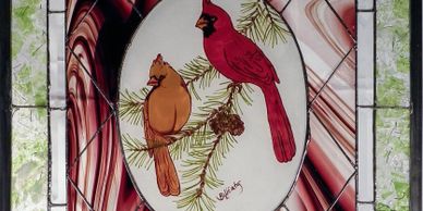 The oval bird glass has been hand painted by Martha using metallic oxides then kiln fired. The window features hand made art glasses from around the U.S.