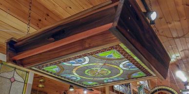 Custom kitchen ceiling light box is 32" x 32" using local popular with oak dowels. the stained glass adds bright kitchen lighting and color accents.